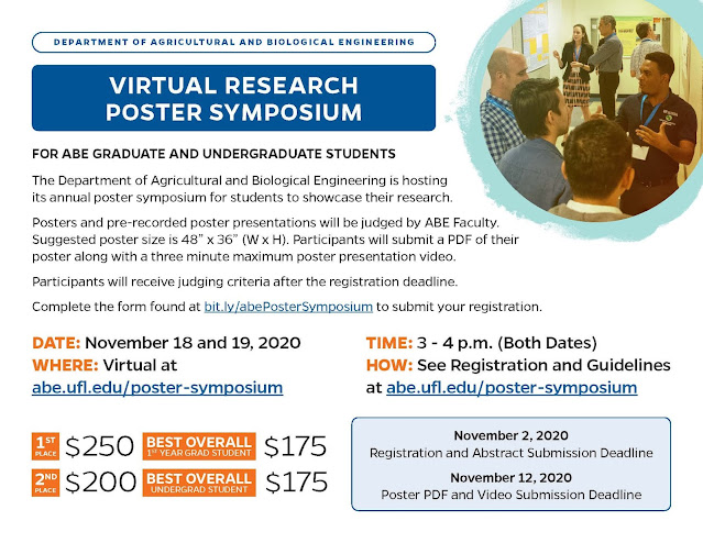 Students, be sure to register to participate in the ABE Virtual Poster Symposium. Go to abe.ufl.edu/poster-symposium for complete information and guidelines